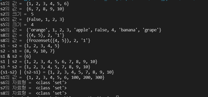print("s5의 값 = ", s5) #1과 True는 동일한 값으로 간주하여 무시됨