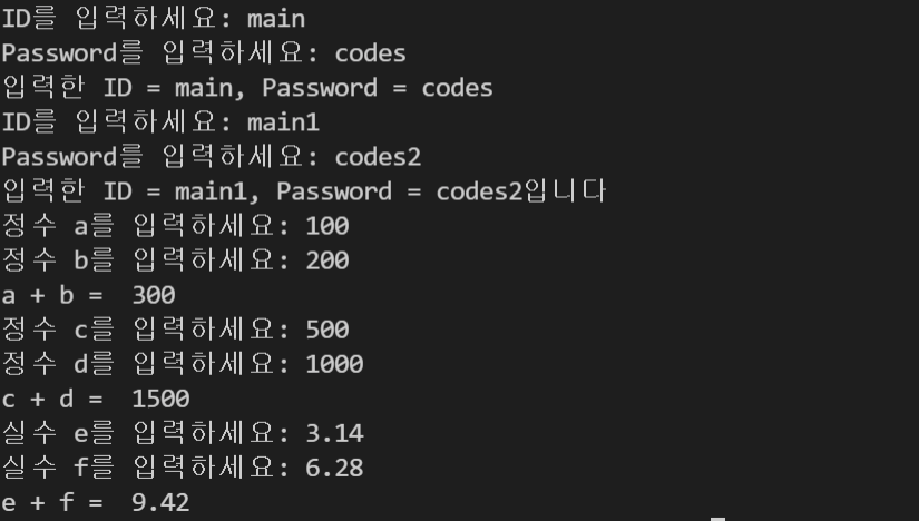 print("입력한 ID = " + id + ", Password = "+ password + "입니다")