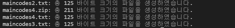 실행 후 c:\temp 폴더에는 다음과 같이 maincodes2.txt, maincodes4.zip, maincodes4.txt, maincodes3.txt이 생성된 것을 확인할 수 있으며 .txt 파일들은 텍스트 에디터로 열어보면 각 모드에 맞게 파일 내용이 생성된 것을 볼 수 있습니다. .zip 파일은 압축을 해제한 후 .txt 파일을 텍스트 에디터로 확인할 수 있습니다.