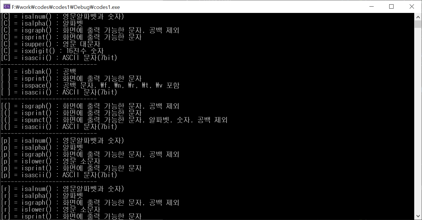 printf("[%c] = ispunct() : 화면에 출력 가능한 문자, 알파벳, 숫자, 공백 제외\n", ch);