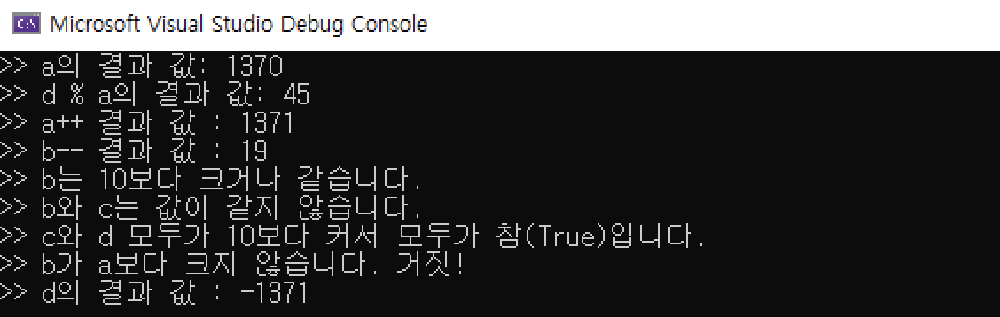 printf(">> c와 d 중 10보다 작은 값이 있어 거짓(False)입니다.\n");