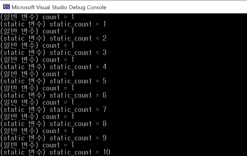 실행된 결과를 살펴보면 일반적으로 선언된 count 변수는 변수의 생존 범위가 func() 함수 내부에만 국한되어 있어 main()함수에서 반복적으로 func()함수를 호출해도 계속 동일 한 1이 출력되지만, static 키워드를 지정한 static_count는 계속 누적되어 적용 범위가 main()함수 영역까지 넓혀진 것을 알 수가 있습니다.