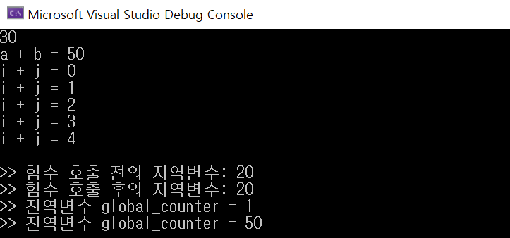 //그래서, 결과가 누적되지 않고 함수 호출 전과 후의 값이 동일함 printf(">> 함수 호출 후의 지역변수: %d\n", c); //전역변수의 테스트