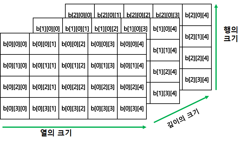 3차원 배열은 각각의 원소를 가리키는 인덱스를 3개 사용합니다. 3차원 배열은 입체적으료 표현되지만 깊이만 추가되었을 뿐 원리는 비슷하니다. int b[3][4][5]의 경우 맨 앞의 인덱스는 깊이, 두번째 인덱스는 행(4줄), 세번째 인덱스는 열(5칸)을 의미합니다. 첫번째 인덱스를 제외하고 생각하면 2차원 배열과 동일합니다.