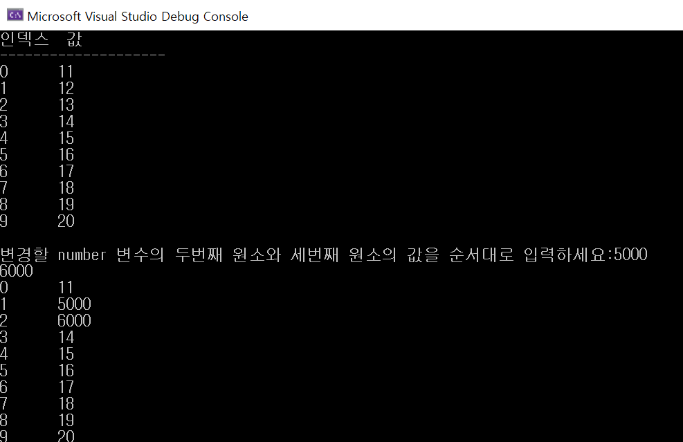 실행결과를 보면 처음 초기화한 값하고 다르게 number변수 1번째 2번째 원소의 값이 새로 입력한 값인 5000과 6000으로 변경된 것을 알 수 있습니다.