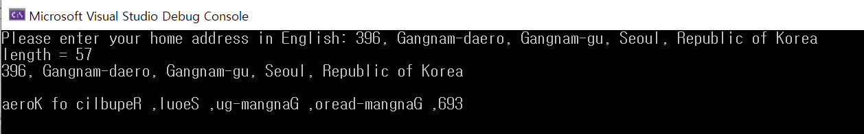 배열의 원리를 파악하기 위해 먼저 간단한 예제를 작성해 보도록 하겠습니다. 아래 코드는 home_address라는 char 배열을 256의 크기로 선언하였습니다. 영어로 주소를 입력 받은 후 18라인의 for문을 이용하여 home_address[i]; 배열에 저장되어 있는 값을 인덱스(i변수) 0 ~ length까지 이동시키며 화면에 한글자씩 출력합니다. 그런 다음 다시 배열을 역순으로 length ~ 0의 인덱스까지 화면에 한글자씩 다시 출력합니다.