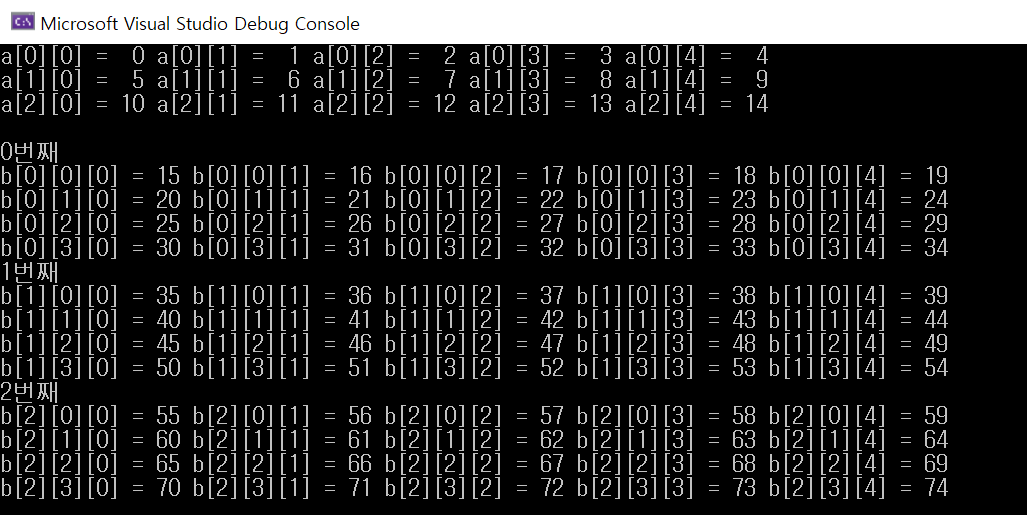 아래 예제는 2차원, 3차원 배열을 선언하고 모든 원소에 값을 넣은 후 다시 모든 원소를 화면에 출력하는 예제입니다.