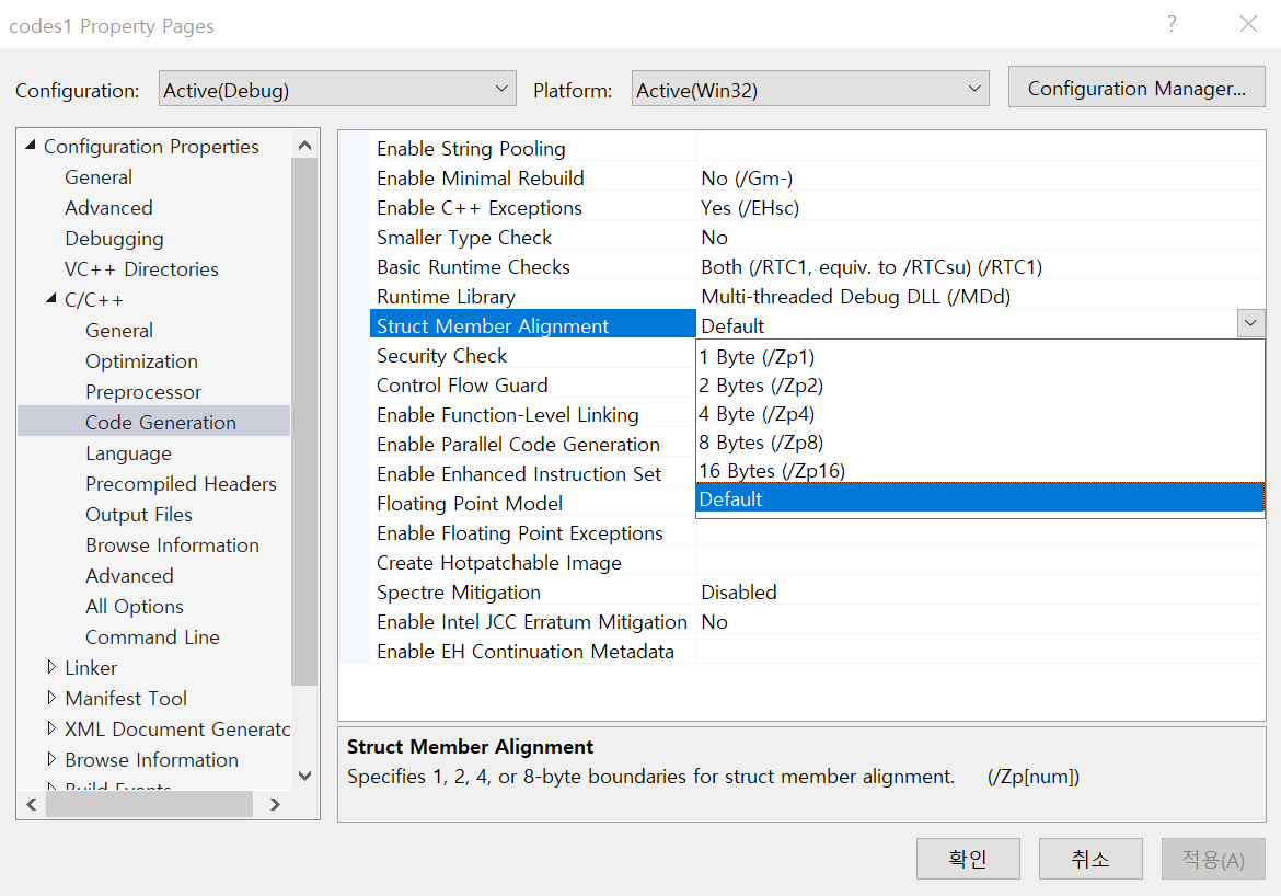 (참고) Visual Studio 2019는 #pragma 지시어를 사용하지 않고 프로젝트 속성에서 동일하게 구조체를 1바이트 크기로 정렬할 수 있습니다. 아래 그림을 참고하세요.