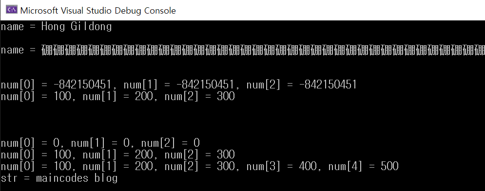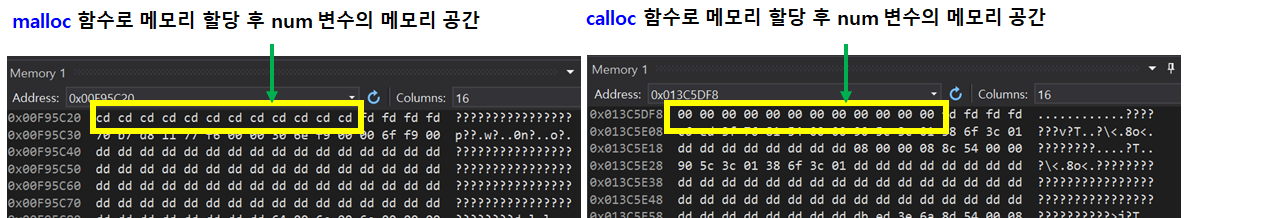 예제에서는 malloc()과 calloc()으로 num변수에 메모리를 할당한 후 바로 printf()로 값을 출력하였습니다. 출력된 값들을 비교해 보면 malloc()함수 후에는 알 수 없는 값들이 출력되고 calloc()함수 후에는 모두 0으로 초기화 된것을 알 수 있습니다.