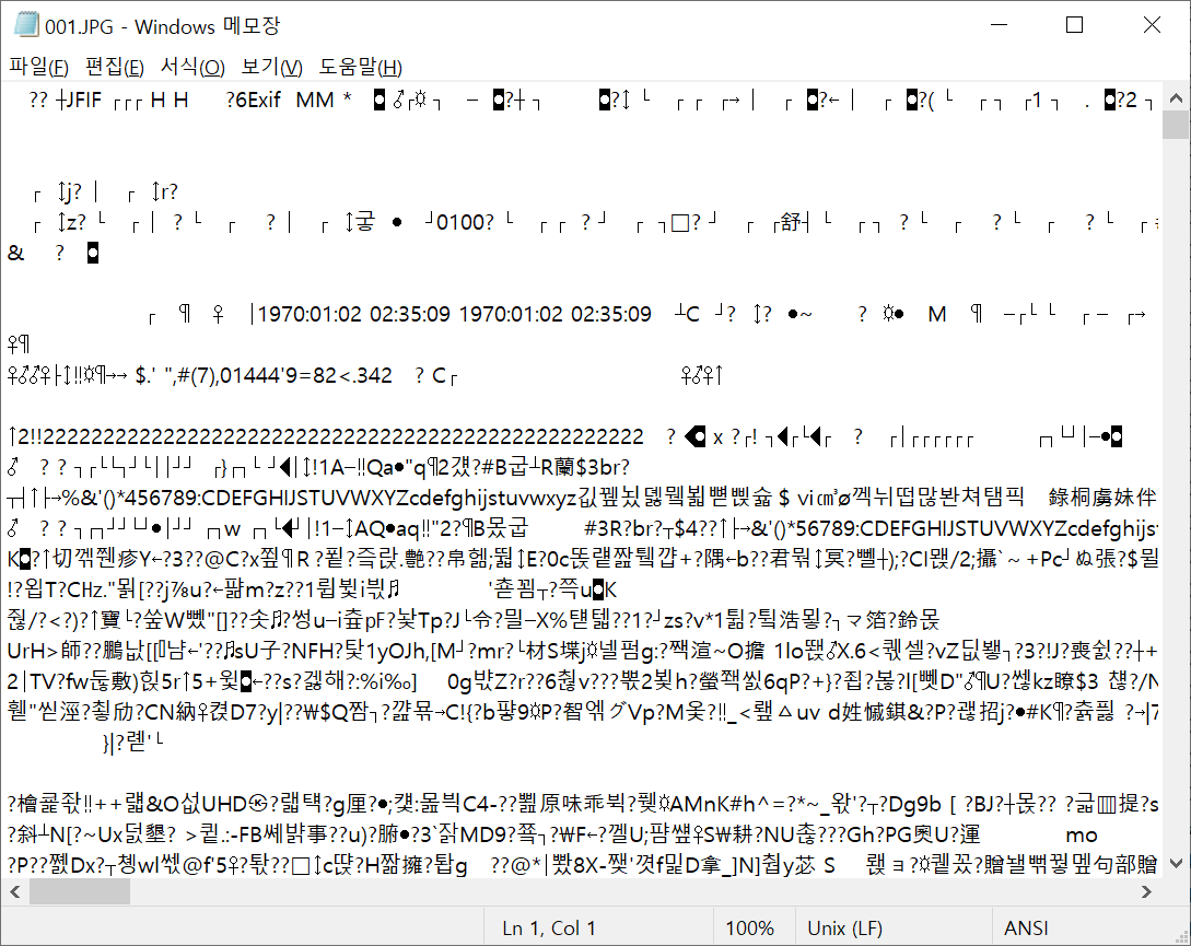 단순히 텍스트인지 바이너리 파일인지 구분하는 방법은 메모장으로 열었을 때 텍스트 파일은 읽은 수 있지만 바이너리 파일은 알 수 없는 문자가 나오게 됩니다.