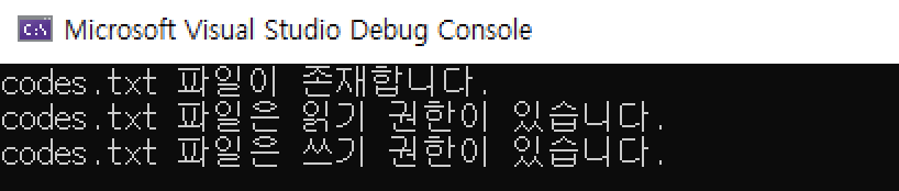 1 2 3 4 5 6 7 8 9 10 11 12 13 14 15 16 17 18 19 20 21 22 23 24 25 26 27 28 29 | #pragma warning(disable: 4996) #define _CRT_SECURE_NO_WARNINGS 1 #include <stdio.h> #include <io.h> int main() { char filename[256] = "codes.txt"; if((access(filename, 0) != -1)) //파일 존재 여부 체크 { printf("%s 파일이 존재합니다.\n", filename); if((access(filename, 4)) == -1) // 파일 읽기 권한 체크 printf("%s 파일은 읽기 권한이 없습니다.\n", filename); else printf("%s 파일은 읽기 권한이 있습니다.\n", filename); if((access(filename, 2)) == -1) // 파일 쓰기 권한 체크 printf("%s 파일은 쓰기 권한이 없습니다.\n", filename); else printf("%s 파일은 쓰기 권한이 있습니다.\n", filename); } else printf("%s 파일이 존재하지 않습니다.\n", filename); return 0; } |