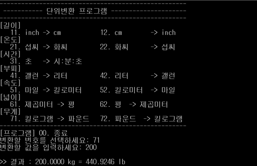 printf(" 71. 킬로그램 -> 파운드 72. 파운드 -> 킬로그램\n");