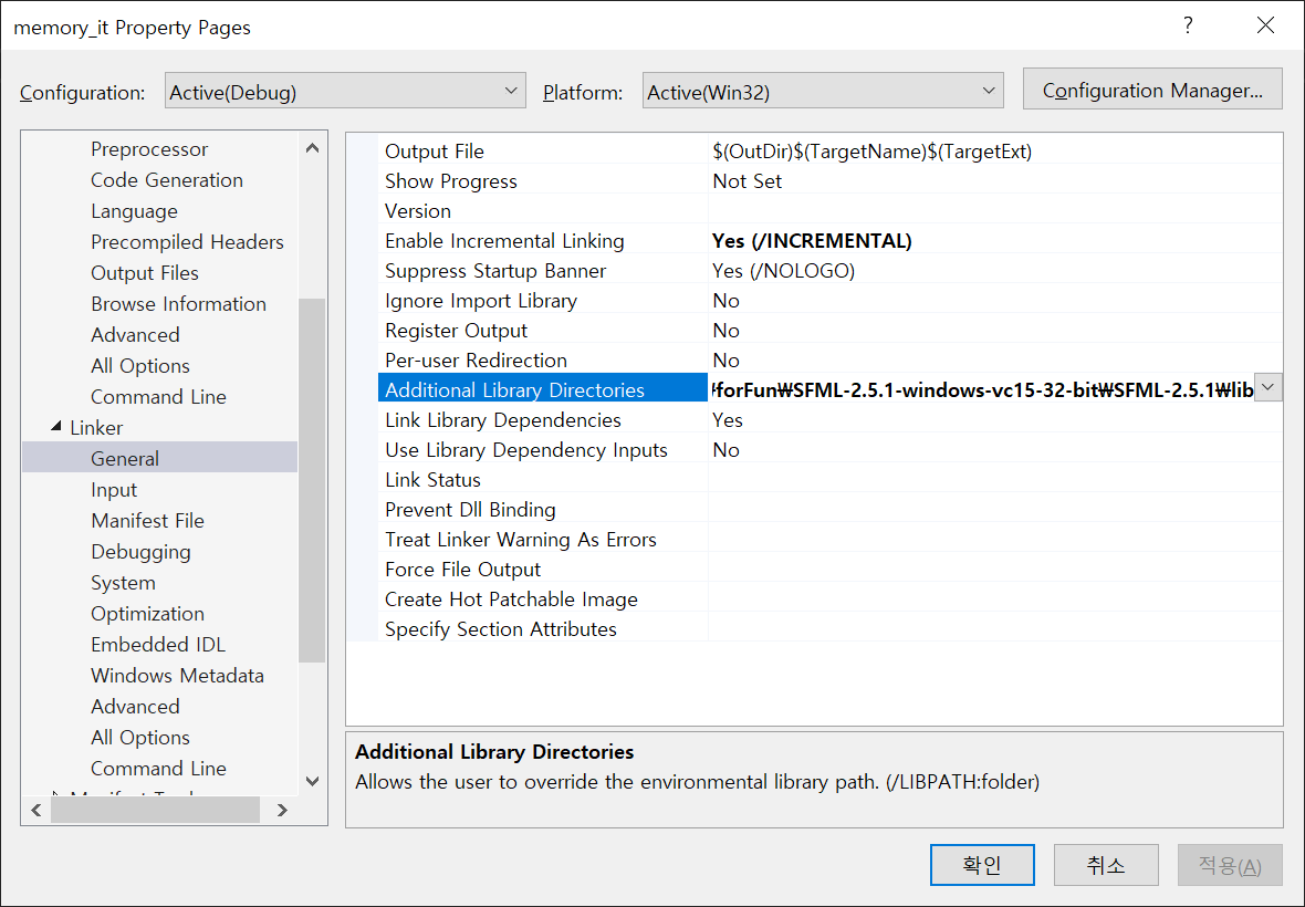 F:\forFun\SFML-2.5.1-windows-vc15-32-bit\SFML-2.5.1\lib 폴더를 다음과 같이 Linker - General의 Additional Library Directories에 설정합니다.