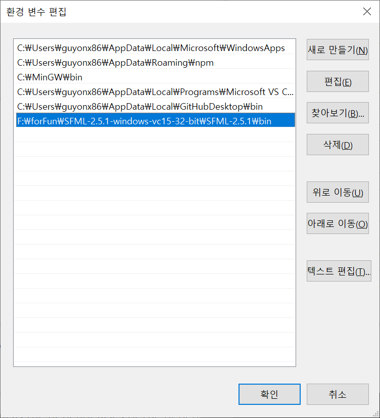 마지막으로, F:\forFun\SFML-2.5.1-windows-vc15-32-bit\SFML-2.5.1\bin 에 있는 DLL들 중 종속성이 있는 DLL들은 컴파일 후 실행파일(.exe)이 생성된 곳에 있어야 합니다. 또는 환경변수(사용자 변수)의 path변수에 F:\forFun\SFML-2.5.1-windows-vc15-32-bit\SFML-2.5.1\bin의 경로를 추가해 줍니다.(시스템속성 - 환경변수 - 사용자 변수 - Path)