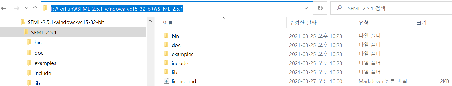 저의 경우는 32bit를 다운로하여 Visual Studio 2019에서 사용하고 있습니다. 다운로드 하면 SFML-2.5.1-windows-vc15-32-bit.zip 파일을 원하는 폴더에 압축을 해제합니다. 저는 F:\forFun\SFML-2.5.1-windows-vc15-32-bit에 압축을 해제 했습니다. 압축을 해제하면 SFML-2.5.1 폴더는 다음과 같은 하위 폴더들이 존재합니다.