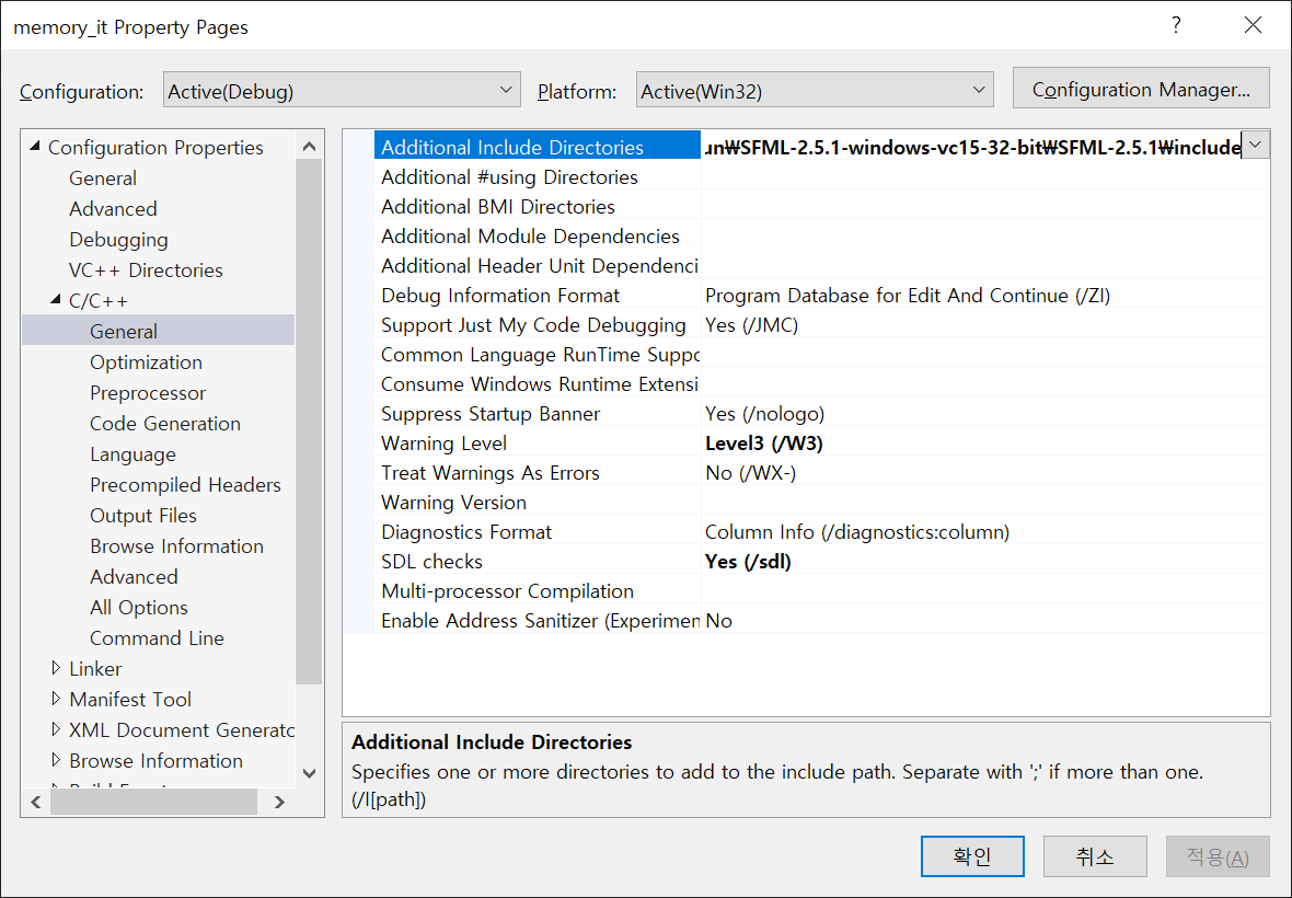 F:\forFun\SFML-2.5.1-windows-vc15-32-bit\SFML-2.5.1\include 폴더를 다음과 같이 C/C++ - General의 Additional Include Directories에 설정합니다.
