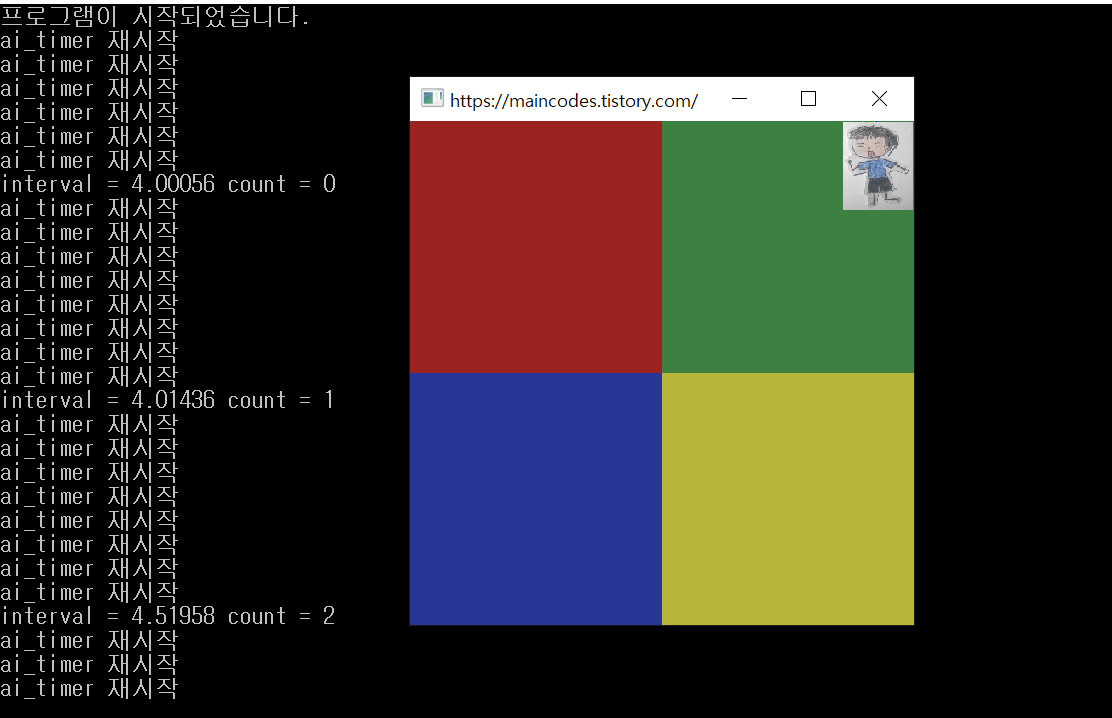 예제는 2개의 그림 파일(colors_on.png, colors_off.png) 파일을 읽고 if (((int)interval % 2) == 0) 조건에 따라 약 1초 단위로 sprite_on과 sprite_off를 화면에 출력합니다.