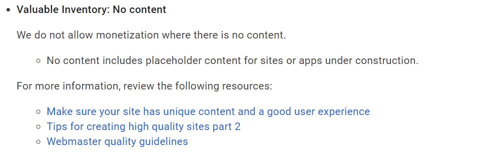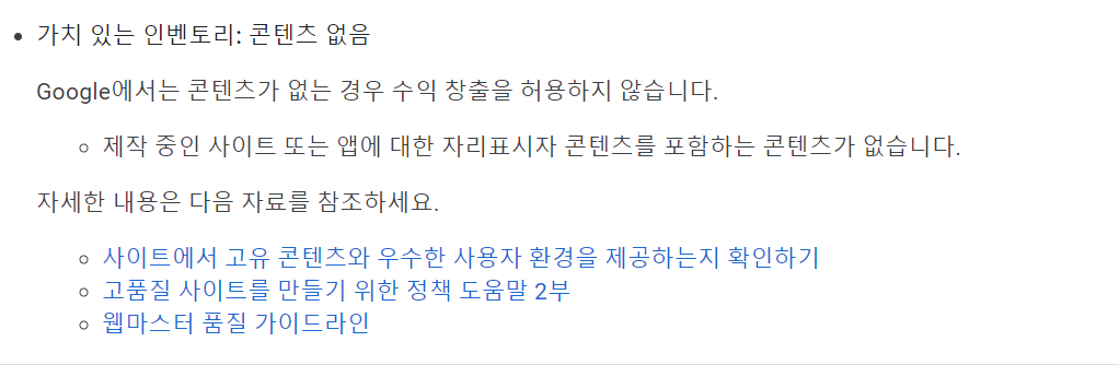 애드센스(www.google.com/adsense) 로그인 해서 거부 사유를 보니 "애드센스를 사용하려면 위반사항을 수정해야 합니다"라고 하면서 아래와 같이 안내가 써져 있어요. "제작 중인 사이트 또는 앱에 대한 자리표시자 콘텐츠를 포함하는 콘텐츠가 없습니다"