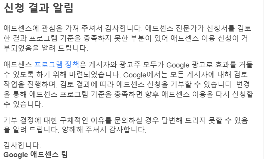 처음 블로그할 때는 애드센스가 뭐가 중한디?라고 생각했다가 나도 해볼까 ?로 생각이 바뀌면서 신청하고 은근히 기대했는데 결과는 떡하니 거부 났어요. 메일로는 다른 분들처럼 이렇게 왔구요.