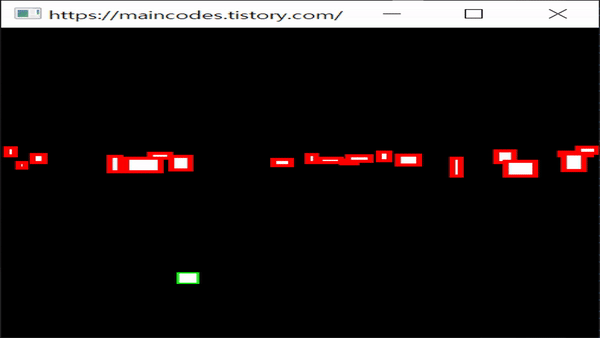 기본 컨셉은 먼저 MAX_ENEMY_COUNT 20개 만큼 enemies 에 저장합니다. 20개의 적들은 1~25 x 1~25의 랜덤한 크기로 1~500의 랜덤한 위치에서 등장합니다. 사용자는 상/하/좌/우 방향키로 플레이어(rect_player)를 조정하여 위에서 아래로 박스들과의 충돌을 시도합니다.