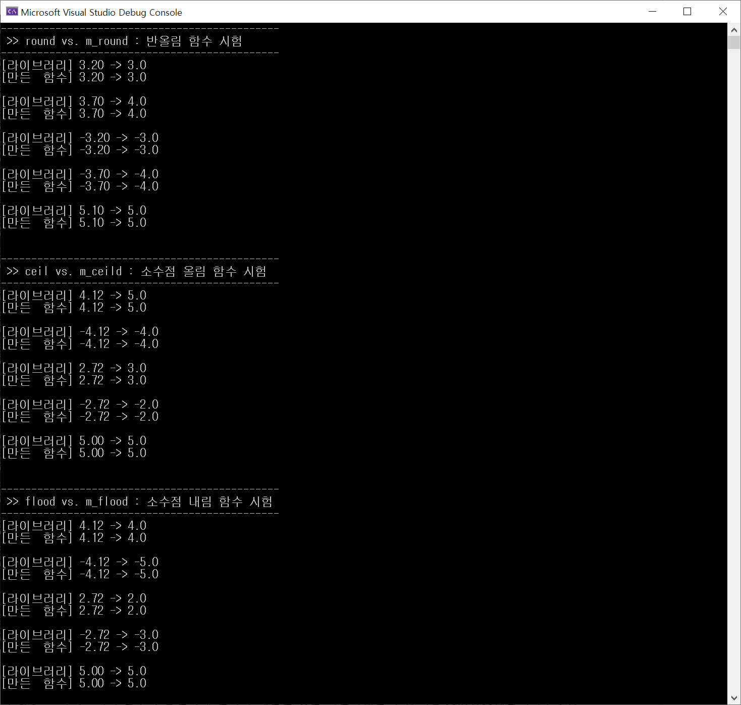 수학 함수 결과 비교(사용자 정의 함수 vs. C/C++ 라이브러리 함수):