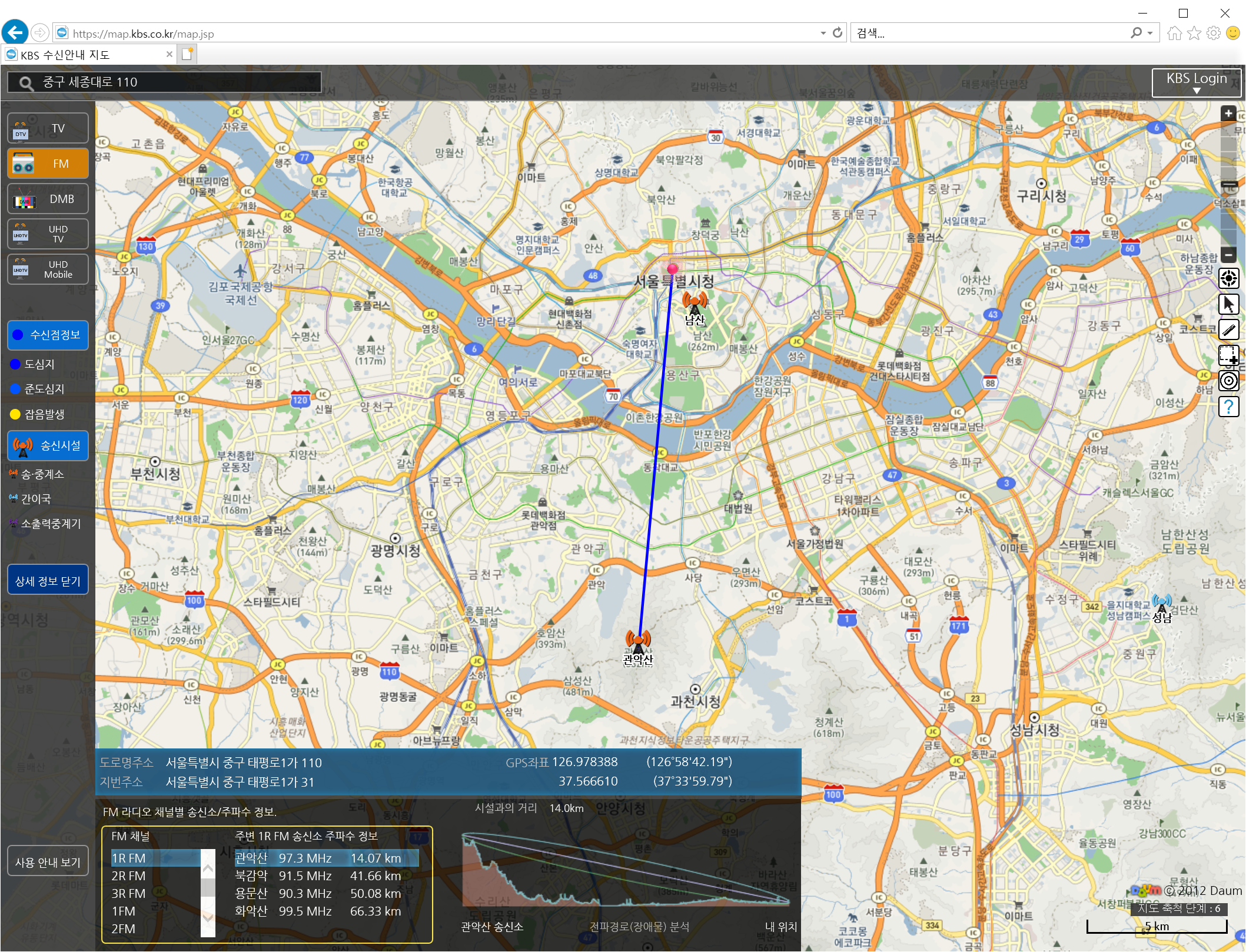 외부에서는 잘 나오는데 집에서 이리저리 돌아다녀보며 채널 주파수 잡아 봤는데 방마다 주파수 세기가 다른 건지 난청지역이라 그런 것인지 구글링 해보니 KBS에서 제공하는 "KBS 수신 안내 지도"라는 사이트가 있었네요. 서울시청 부근은 관악산 송신소로부터 FM 신호를 수신받는 것으로 나옵니다. 라디오 외 TV, DMB 등에 대한 수신 정보도 함께 보여 주니 참고하세요~