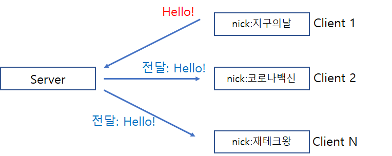 1:N 채팅 프로그램은 기본적으로 TCP 프로토콜을 기반으로 1개의 서버가 N개의 클라이언트(사용자)를 지원합니다. 아래 개념도에서와 같이 각 클라이언트는 서버를 통해 서로 채팅 메시지를 주고받을 수 있어요.