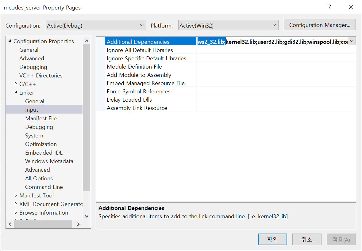 아래 그림의 Property Pages는 Project-Properties 메뉴(단축키 : Alt+F7)를 통해 열 수 있습니다. ws2_32.lib를 Linker-Input-Additional Dependencies에 아래 그림과 같이 추가해 주세요.