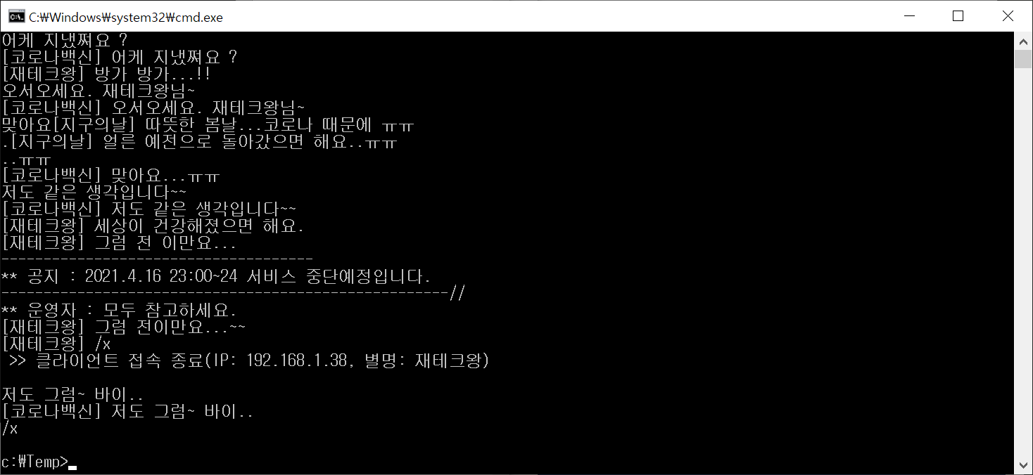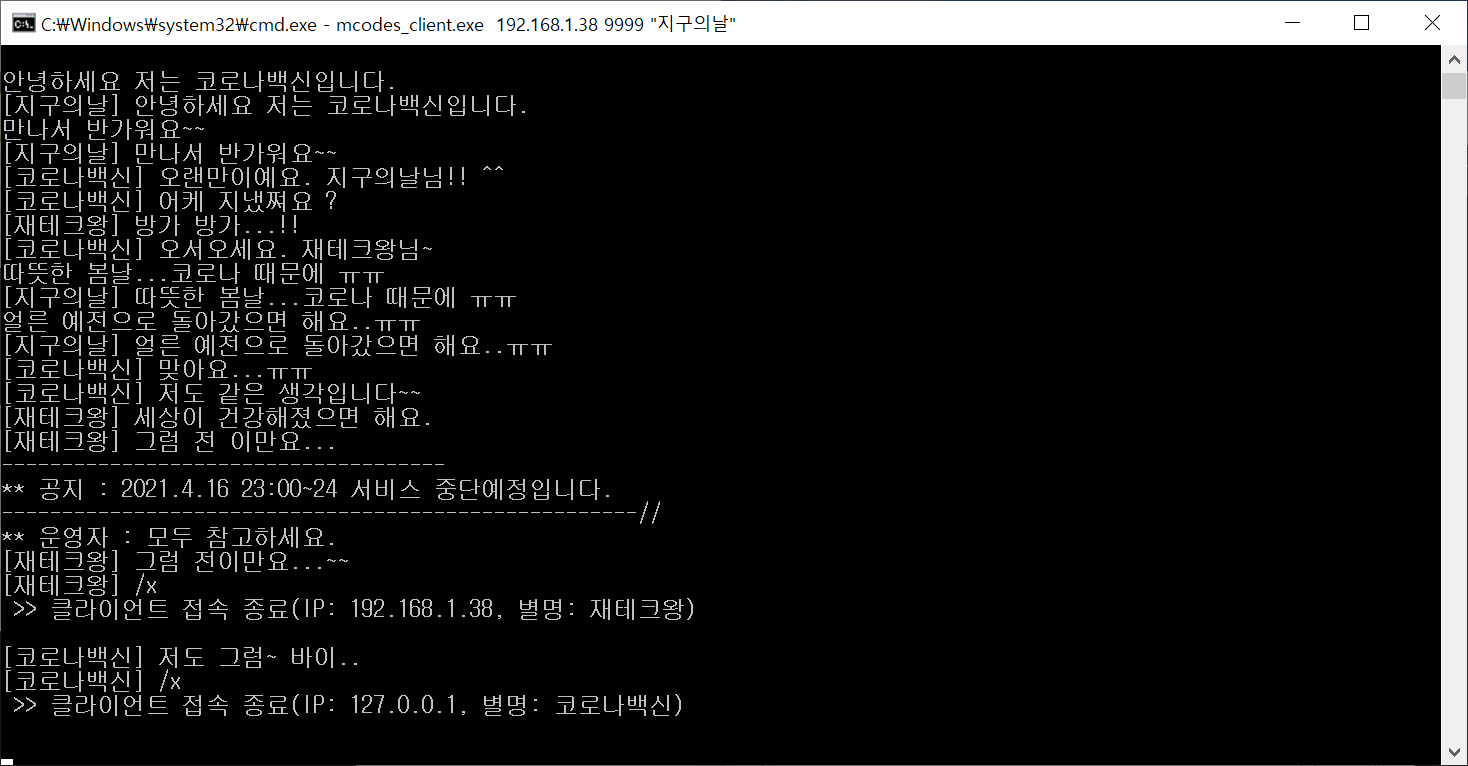 채팅 서버와 클라이언트 실행결과: