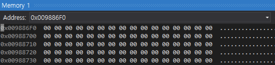 반면, malloc() 함수와는 다르게 calloc()함수를 사용한 경우 0x009886F0(buf2의 시작 주소)에 할당된 100바이트의 메모리가 모두 0(NULL)로 초기화 되어 있는 것을 확인 할 수 있습니다.