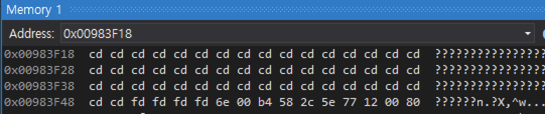 위 그림에서 보는 바와 같이 0x00983F18(buf1의 시작 주소)로부터 50바이트의 할당된 메모리 값이 알 수 없는 값(0xCD)으로 채워져 있는 것을 볼 수 있습니다. malloc()함수 호출 후 memset()함수를 이용하여 buf1 메모리를 0(NULL)으로 초기화가 가능합니다.