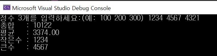 | ■ scanf 정수 3개 입력 받고 총합, 평균, 작은수, 큰수 구하기 |