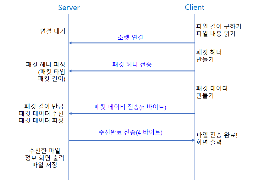 이후 클라이언트는 보내는 파일명과 파일 데이터가 포함된 패킷 데이터를 서버에 전송하고 서버는 패킷 헤더 내 패킷 길이만큼 패킷 데이터를 수신한 후 패킷 데이터에서 파일명을 분리하여 수신한 파일명으로 파일 데이터를 저장합니다.