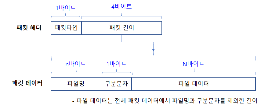 그래서 클라이언트가 서버에 파일을 보낼 때에는 다음과 같은 규약에 맞춰 파일을 보내고 서버는 동일한 규약을 따라 파일을 수신하도록 했습니다.