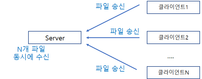 프로그램의 기본적인 개념은 다음 그림과 같이 클라이언트는 파일을 전송하고 서버는 N개의 클라이언트들로부터 파일을 수신하여 지정된 폴더에 저장합니다.