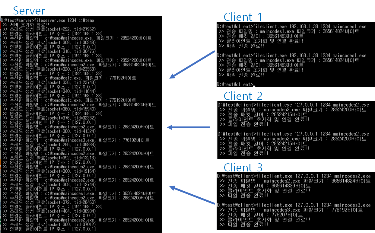 클라이언트 1은 가장 큰 파일을 전송하기 때문에 가장 먼저 파일 전송을 시작했고 그다음 클라이언트 2, 클라이언트 3의 순으로 파일을 전송하였습니다. 전송 테스트 결과 클라이언트 2, 3이 전송한 파일이 작기 때문에 먼저 수신되었고 클라이언트 1이 보낸 파일이 가장 마지막에 전송되었습니다. 결과적으로 3개의 클라이언트가 보낸 모든 파일이 정상적으로 수신되어 지정된 폴더에 저장되는 것을 확인할 수 있었습니다.