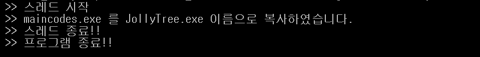예제는 copyFileService() 함수를 스레드 시작 루틴으로 사용하고 스레드 안에서 CopyFile 함수를 호출합니다. 실행결과 JollyTree.exe라는 파일이 정상적으로 복사된 것을 확인할 수 있습니다.