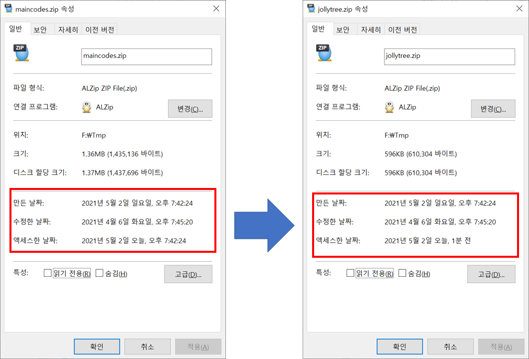 탐색기의 속성 메뉴를 이용하여 maincodes.zip 파일과 jollytree.zip의 MAC Time을 확인해 보면 동일하게 복사된 것을 알 수 있습니다.