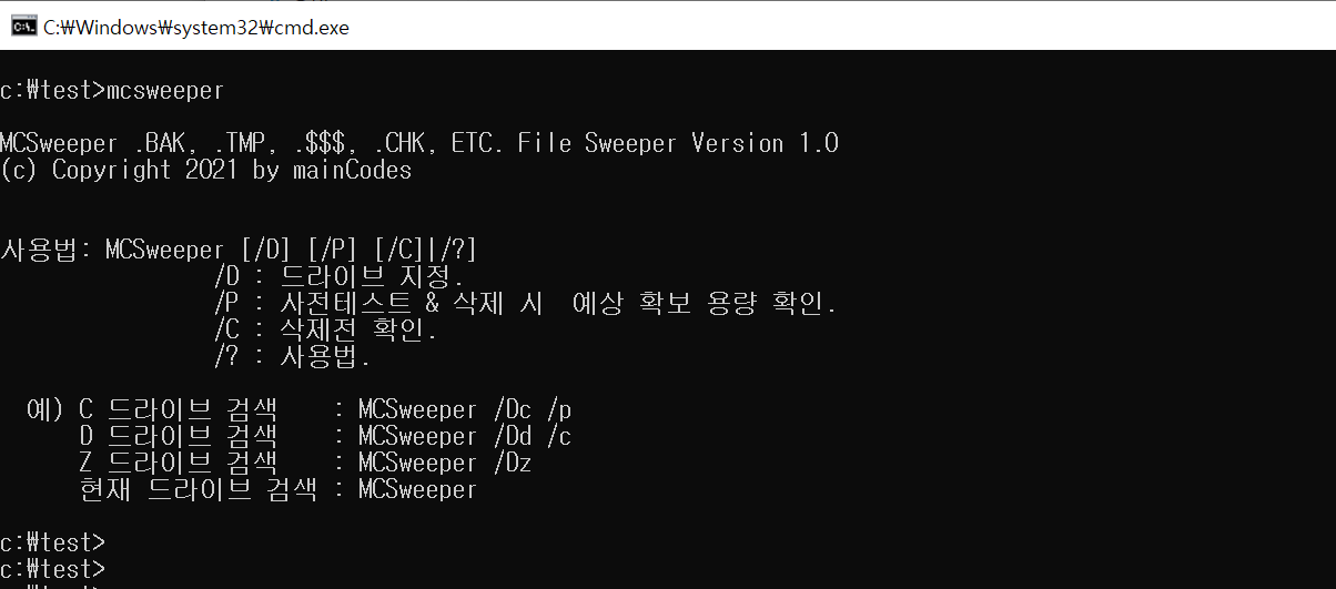 | MCSweeper v1.0 | ▶ 하드디스크(HDD), SSD 내 불필요한 파일 삭제 기능 - BAK, .TMP, .$$$, .CHK 등 ▶ /d /D : 드라이브 선택 기능 - 드라이브 선택이 없으면 현재 드라이브 자동 검색 기능 ▶ /c /C : 삭제 전 삭제 확인 기능 ▶ /p /P : 삭제 전 사전 검색 및 예상 확보 용량 보기 기능 |