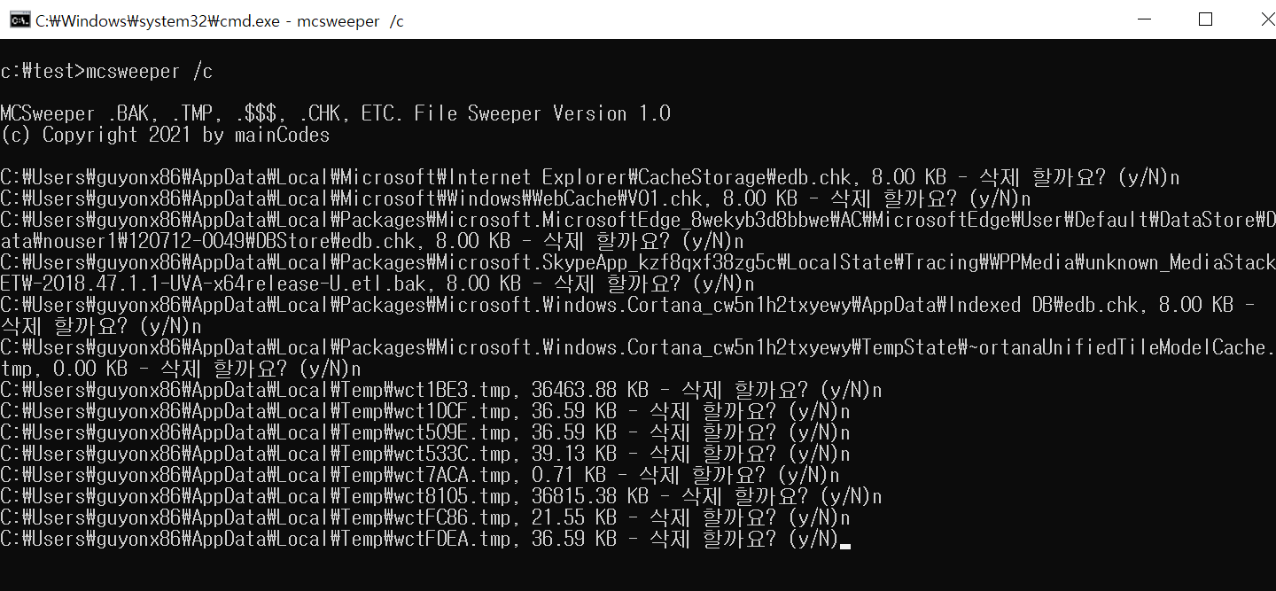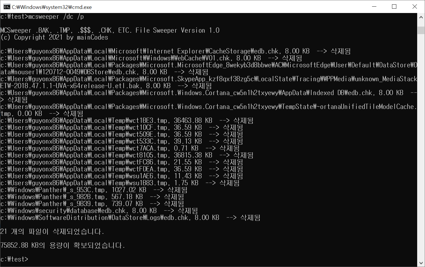 /p 또는 /P 옵션은 실제로 파일을 삭제하지 않고 시뮬레이션을 수행합니다. "--> 삭제됨"이라고 나오지만 실제 삭제가 되지 않습니다. 이 옵션을 사용하면 예상 삭제 파일목록과 예상 확보 용량을 확인할 수 있습니다.