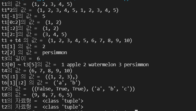 print("t1[2:]의 값 = ", t1[2:]) #두번째 이후 요소부터 출력